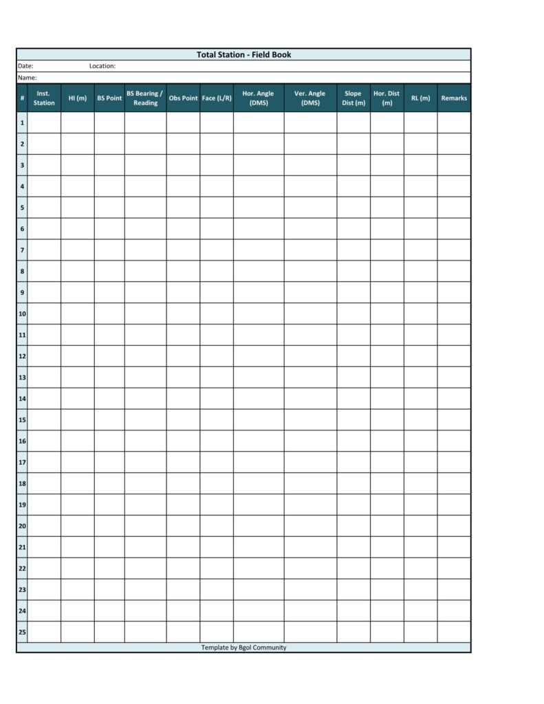 The Total Station Field Book is your partner for modern surveying needs. Whether you’re recording topography, layout points, or control networks, this PDF simplifies data collection in the field.