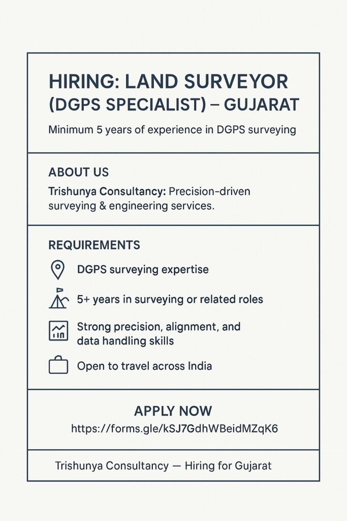 Weโ€™re on the lookout for an experienced Land Surveyor with core expertise in DGPS / RTK surveying. If youโ€™re someone who thrives on precision, terrain challenges, and geospatial data โ€“ this is your moment! โœจ